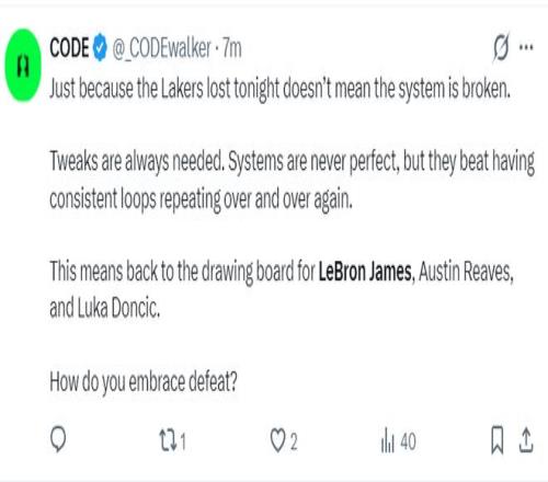 美媒CODE:不要因为湖人输掉了一场比赛就觉得整个体系出了问题,调整是必要的但体系没有任何问题,好的东西需要延续下去,东契奇、里夫斯、詹姆斯的球权可能要调整一下。