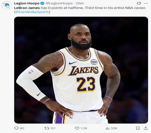整个上半场詹姆斯也是疲态尽显,打无球的各种空切消耗也很大,他半场5中0+三分1中0没有得分送出6个助攻,这是他生涯第三次上半场0分的尴尬纪录。